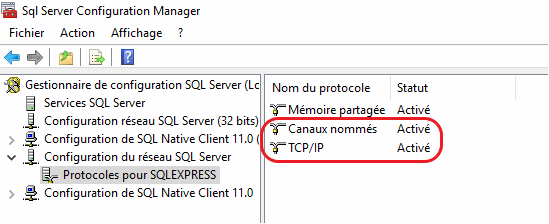 Une fois lancé, cliquer sur « Configuration du réseau SQL Server » et « Protocoles pour SQLEXPRESS ». Sur la droite vous verrez que « Canaux nommés » et « TCP/IP » sont désactivés.