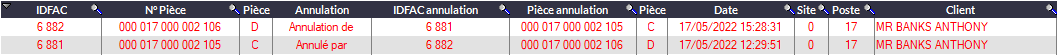- Type ANL : règlement annulé à la suite d'une annulation de facture (l'annulation d'une facture entraîne automatiquement l'annulation de son règlement).