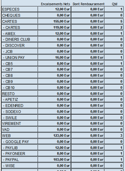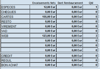 2. Cette zone vous indique la part des remboursements réalisés pour chaque mode de règlement (exemple : sur 155.44€ encaissés en espèces, 1.70€ ont été remboursés au client).