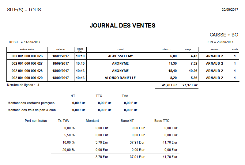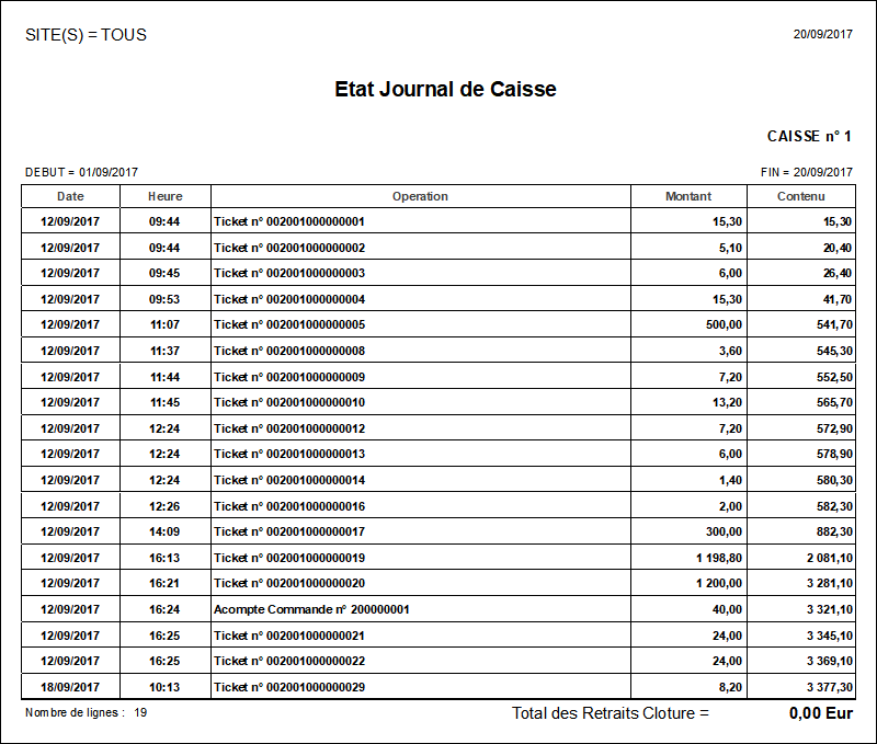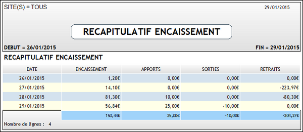 Le journal de caisse liste pour une période, tous les mouvements de caisse (y compris tickets, apports, dépenses et retraits de clôtures).