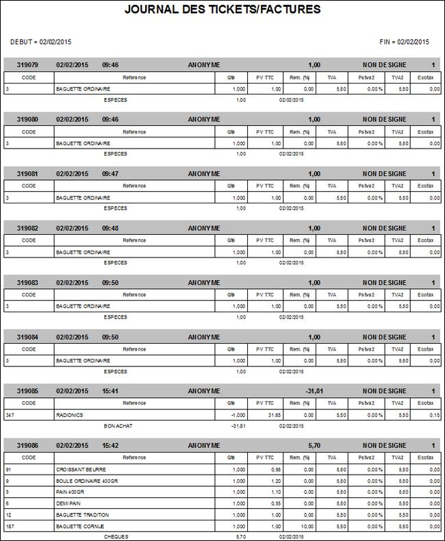L'historique des ventes affiche tous les tickets/factures dans une période donnée, classés par ordre chronologique.