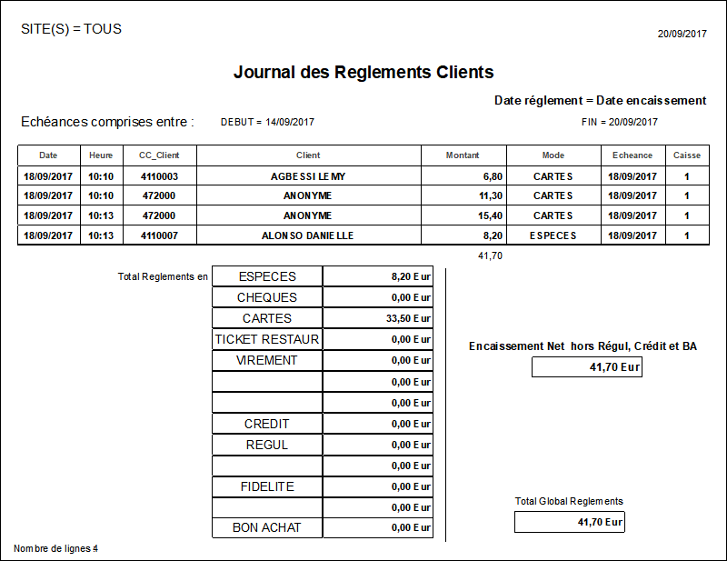 Exemple : Le 15 janvier 2015 vous définissez une période d'analyse du 01-01-2015 au 31-01-2015. Le journal calculera sur la base des tous les règlements y compris ceux à percevoir entre le 16-01 et 31-01. Attention, si l'heure de clôture est au delà de minuit, en mode échéance, le calcul s'arrêtera quand même à minuit.