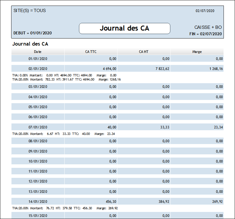 Ce document présente les chiffres d'affaires (caisse + back office) journaliers dans la période demandée (ici du 01/01/2020 au 01/07/2020) avec le détail mensuel réparti par taux de TVA.