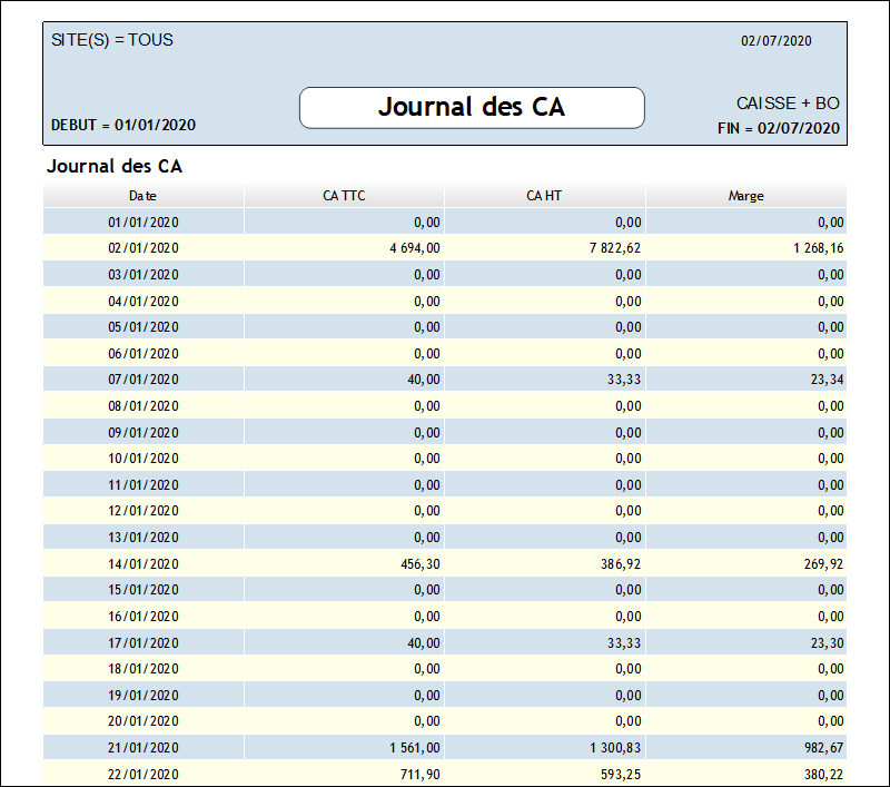 Ce document expose les chiffres d'affaires (caisse + back office) journaliers dans la période demandée (ici du 01/01/2020 au 01/07/2020).