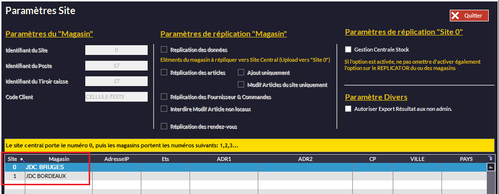 Le sélecteur de site fonctionne si les sites ont été correctement renseignés dans Fichier -> Paramètres Intervenant -> Site :
