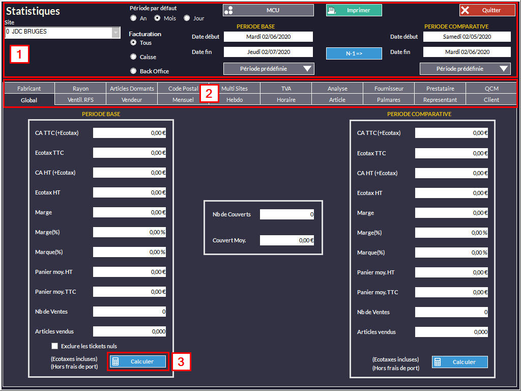 Si vous voulez affiner les résultats, vous pouvez cliquer sur Vendeur, Site ou Caisse et ensuite sur Calculer.