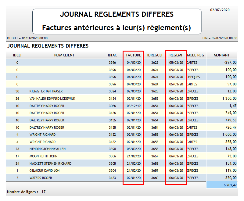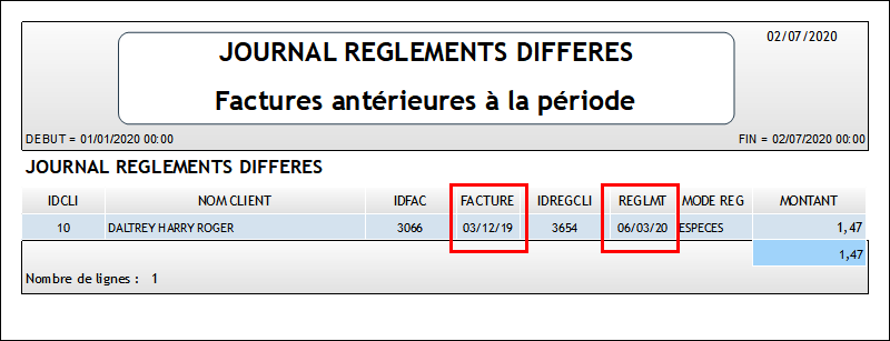 Il vous affichera la liste des règlements différés des factures dont la date est antérieure à la période entrée (ici du 01/01/2020 au 02/07/2020).