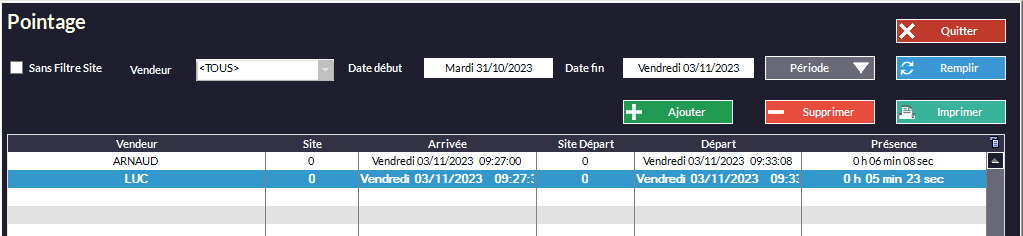 Cet outil permet de suivre les horaires de pointages de vos vendeurs. Il faut que le vendeur soit passé par le menu Caisse -> Pointage (voir Gestion des Vendeurs - Pointeuse).