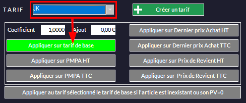 L'opération est la suivante : TARIF PRO = Coefficient* (notez que vous ajouter une somme en Euros) puis un des boutons Appliquer en fonction du prix sur lequel vous voulez appliquer le coefficient.