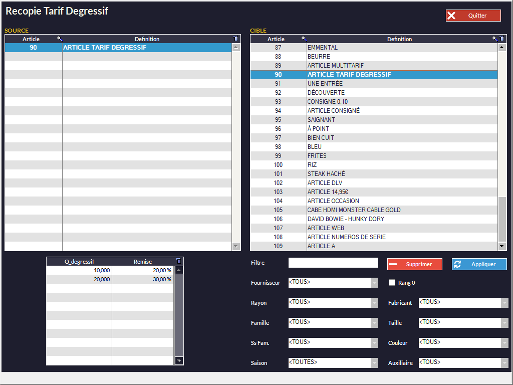 un articledans le tableau de droite (Cible)etunfaitesAppliquer. C'est fait : l'article cible prendra la même forme de tarif dégressif que l'article source. Il est possible de sélectionnerou plusieurs articles pour le(s)quel(s) on souhaite répercuter ce même dégressif (Ctrl-Apour une multi sélection, Ctrl+Clic ouCtrl-Clic)Ctrl+A) - Cliquez sur