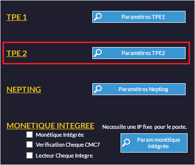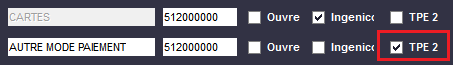 Cliquez sur le menu Fichier -> Paramètres -> Modes Règlement Paiement et créez un nouveau mode de paiement qui sera destiné aux encaissements du second TPE. Cochez la case TPE 2 pour l'activer.