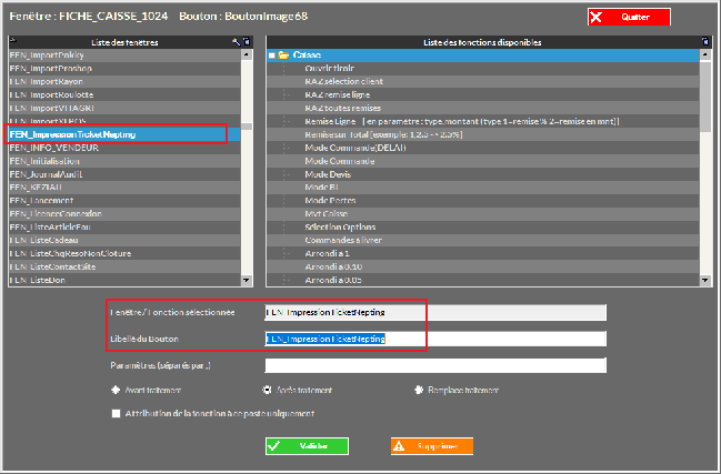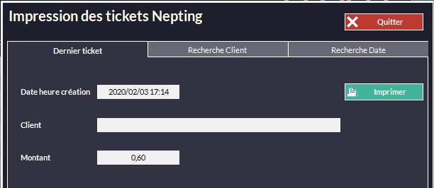 - Il est possible d'imprimer le dernier ticket à condition d'entrer le MCU intégré sur une touche MCU de la caisse [code MCU : Ouvre ("FEN_ImpressionTicketNepting")].