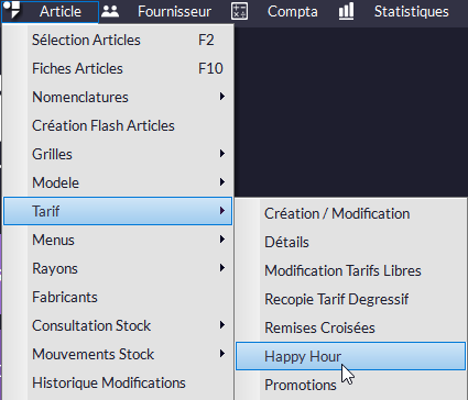 • A l'aide du menu Article -> Tarif -> Grille, créez au préalable le tarif à appliquer aux Happy Hours. Pour connaître la procédure de création des tarifs, consultez le chapitre Gestion d'Articles - Tarifs - Grille de Tarifs.