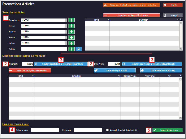 • Vous pouvez paramétrer des promos pour tous vos articles (ou seulement ceux triés par rayon, famille...) en mettant les dates de début et de fin, le pourcentage et en appuyant sur :