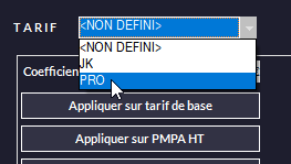 L'opération est la suivante : TARIF PRO = Coefficient*** (notez que vous ajouter une somme en Euros) puis un des boutons Appliquer en fonction du prix sur lequel vous voulez appliquer le coefficient*.*