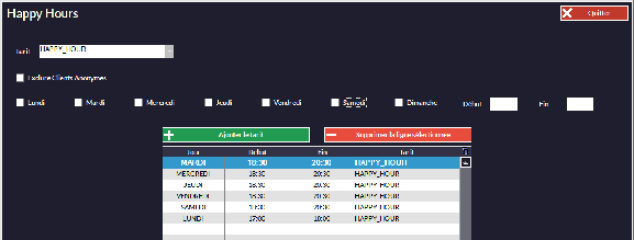 La fenêtre Happy Hour vous permet d'appliquer des tarifs préférentiels à des heures choisies.