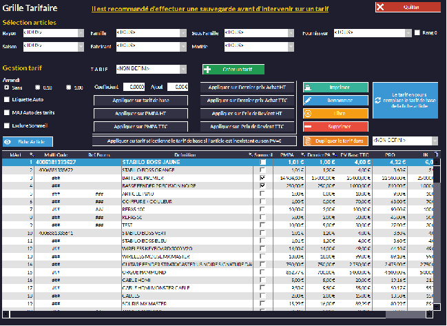 • Faites TOUJOURS une sauvegarde avant de créer un nouveau tarif et de l'appliquer !
