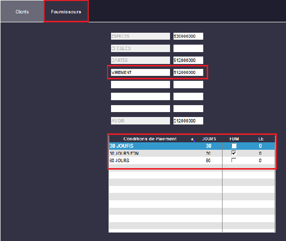 Entrez les modes de règlements fournisseurs souhaités ainsi que les conditions de paiement (FDM = Fin De Mois et LE permet d'en préciser la date).