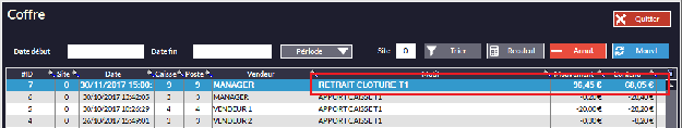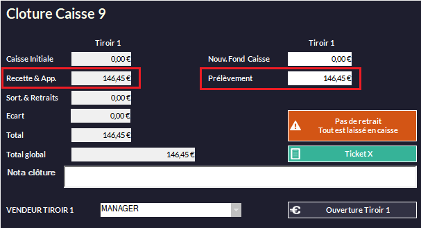 • Lors de la clôture le montant des recettes prélevé sera mis par défaut dans le coffre.