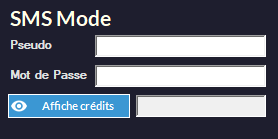 Vous pouvez entrer ici vos paramètres SMS Mode. Sert à faire l'envoi de SMS publicitaires à vos clients (menu Client -> Mailing -> SMS). L'adresse pour s'inscrire est https://kezia.smsmode.com/mb/manageMessagingAccount.do?method=detail |