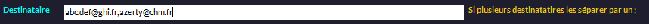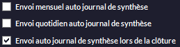 Vous pouvez programmer l'envoi mensuel ou quotidien du journal de synthèse à l'heure que vous voulez, ou à chaque clôture, à l'adresse que vous voulez (à entrer dans le champ Destinataire). Vous pouvez l'envoyer à plusieurs destinataires en même temps en séparant les adresses par un point-virgule :