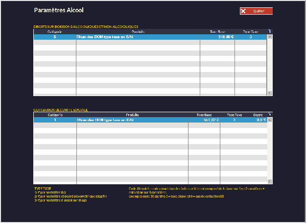 Si vous commercialisez des alcools, cette fenêtre vous permet de configurer les paramètres de base vous permettant de gérer les taxes obligatoires appliquées à ces produits.